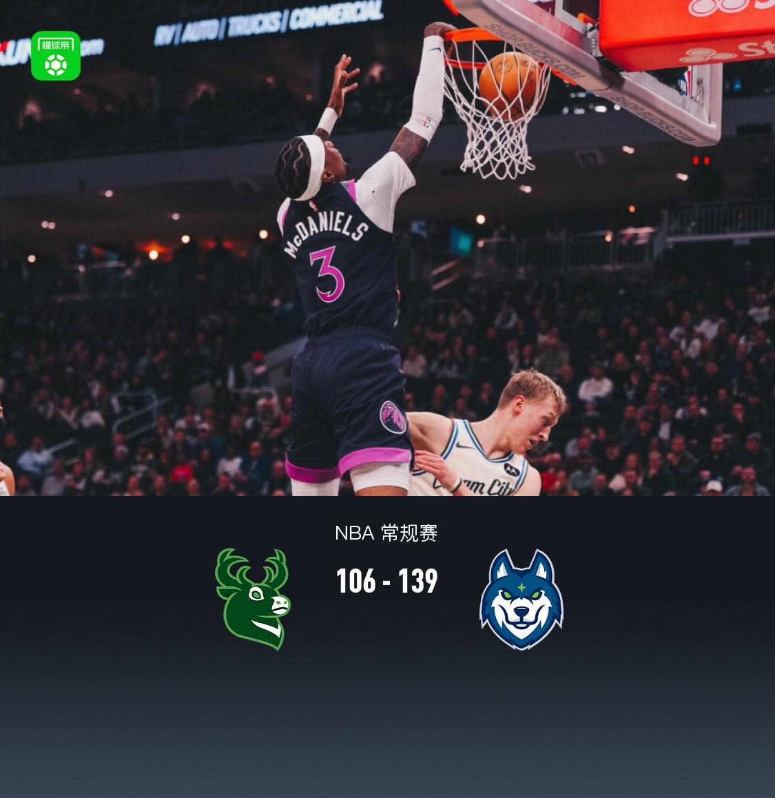 第四节雄鹿科费拿下10分,森林狼伦纳德-米勒拿下7分,最终雄鹿106-139不敌森林狼